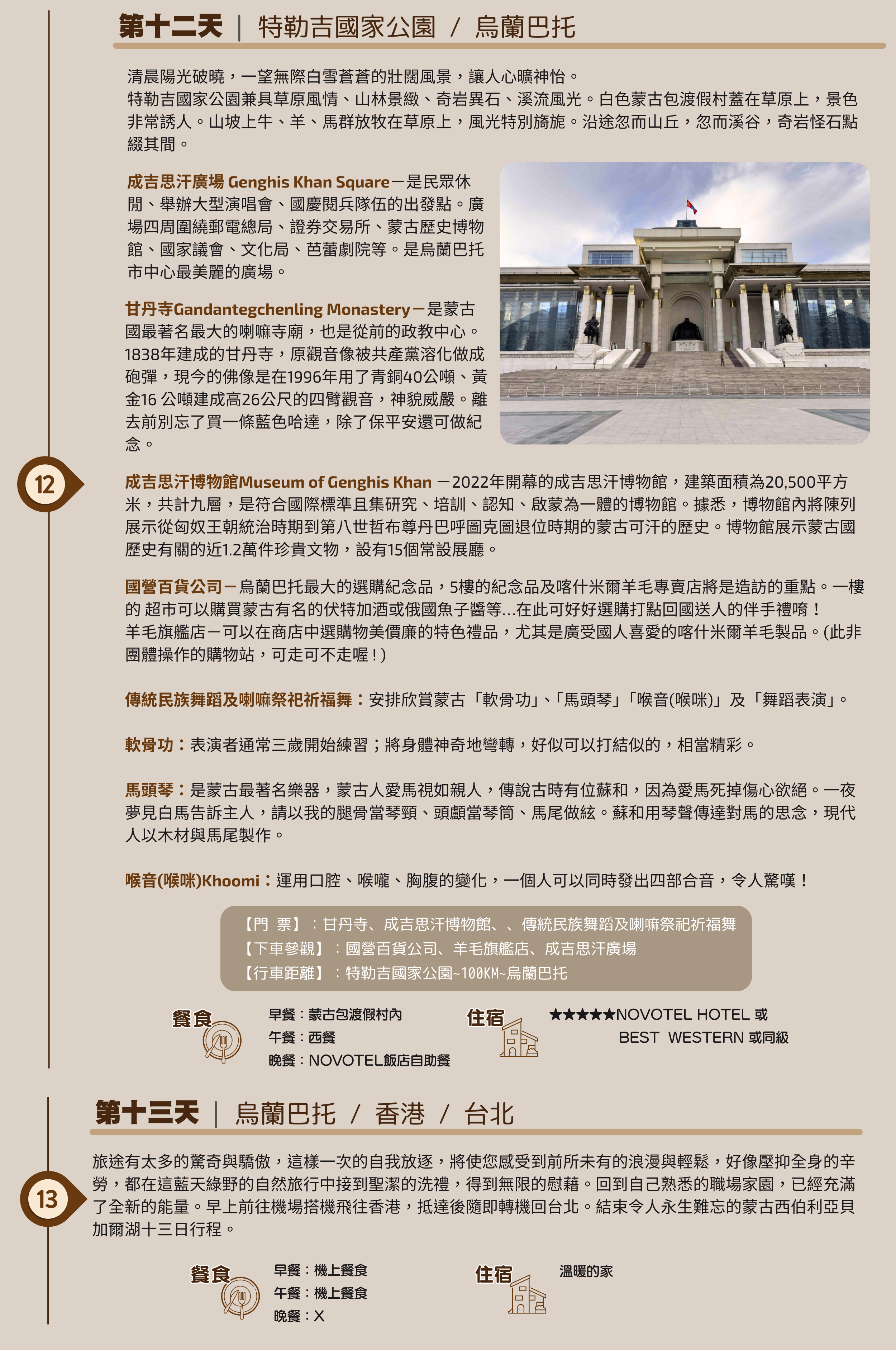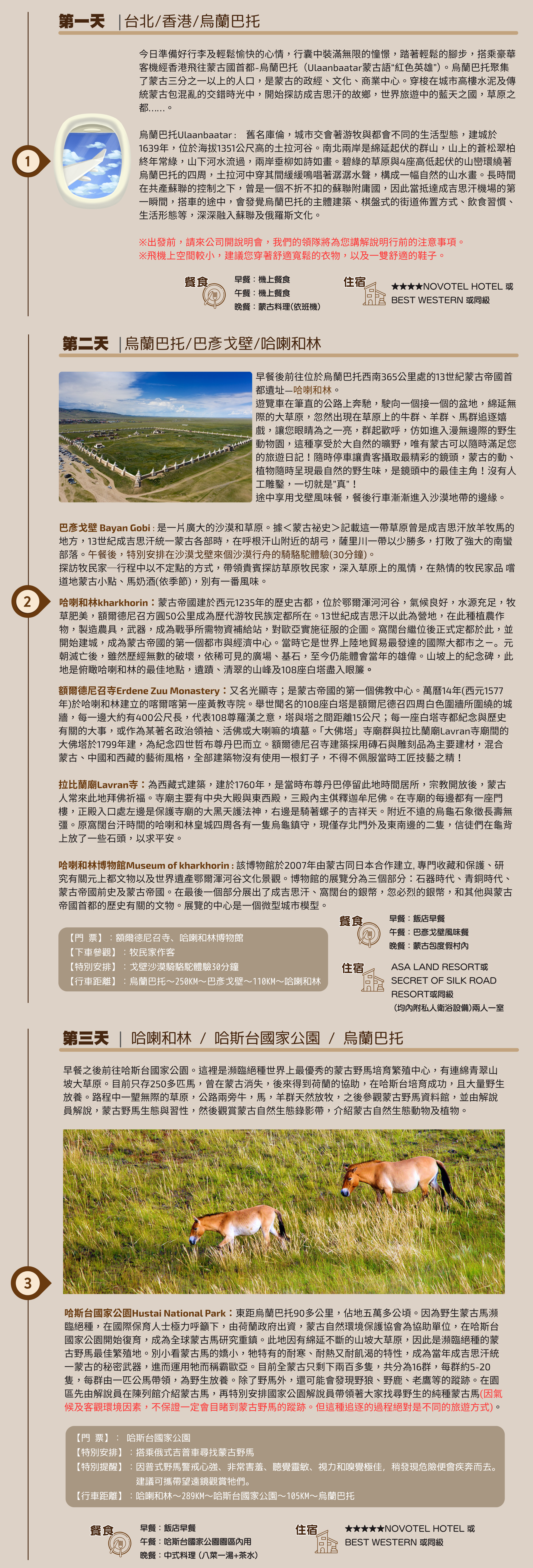 2.以上表列行程,為我們的經驗值,主要是為了讓您在出發前,能初步了解整個行程操作的情形,當然我們的領隊會以此為操作標準,但若遇特殊情況,在考慮行程的順暢度下,若當地導遊及領隊稍作更改,請您見諒。