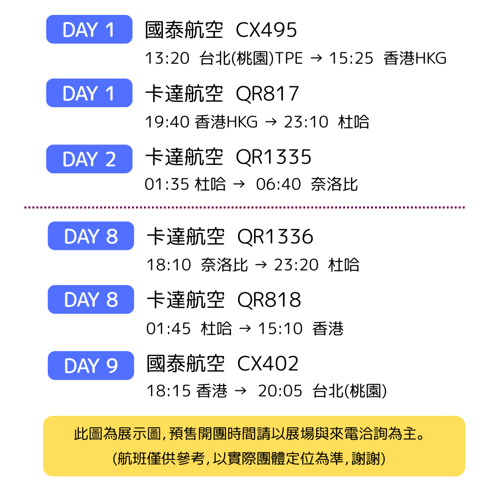 8.以上表列行程,為我們的經驗值,主要是為了讓您在出發前,能初步了解整個行程操作的情形,當然我們的領隊會以此為操作標準,但若遇特殊情況,在考慮行程的順暢度下,若當地導遊及領隊稍作更改,請您見諒。